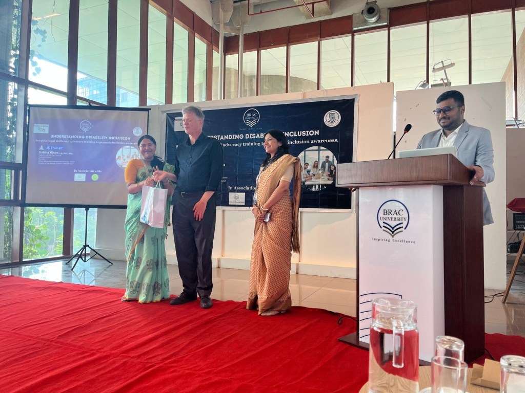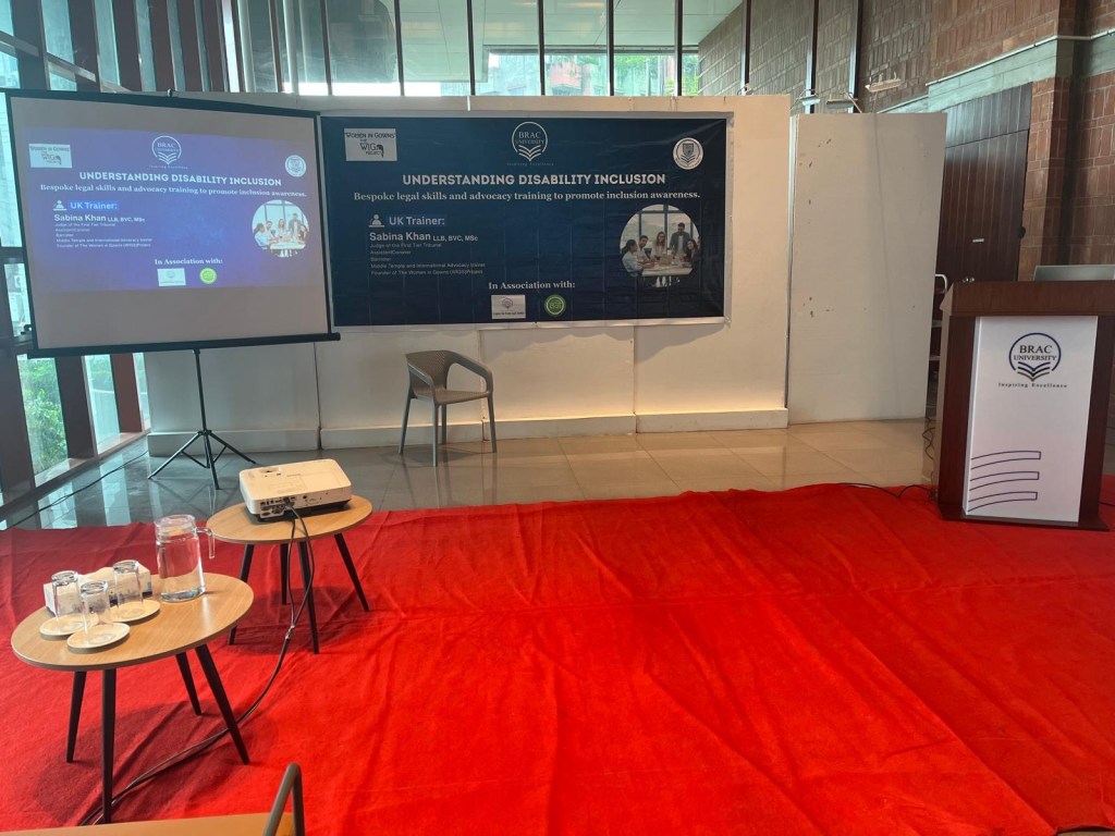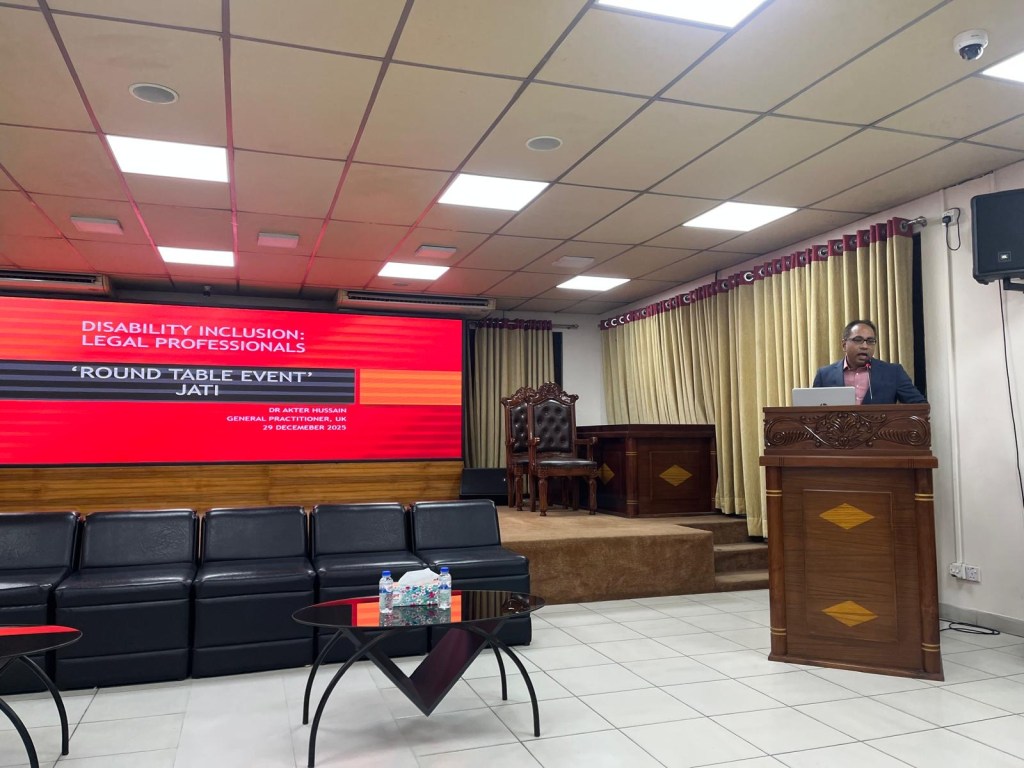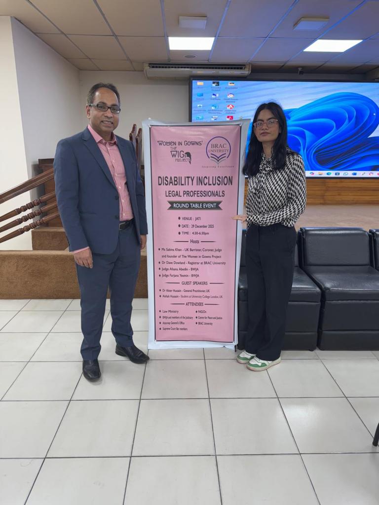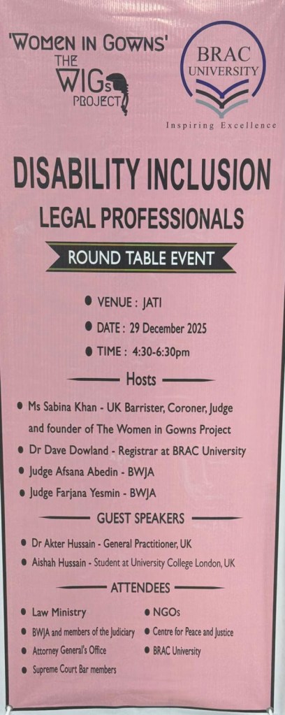 On 29 December 2025, Sabina jointly hosted an event titled ‘Disability Inclusion: Legal Professionals – Round Table Event’. This was a collaborative event hosted by Sabina, Dr Dave Dowland, Registrar at BRAC University and Judge Afsana Abedin and Judge Farjana Yesmin, both of the Bangladesh Women Judges Association. The guest speakers were Dr Akter Hussain, General Practitioner in the UK and Aishah Hussain, student at University College London. The event was attended by the Law Ministry, Non-governmental organisations, Bangladesh Women Judges Association and members of the judiciary, Centre for Peace and Justice, Attorney General’s Office, BRAC university, Supreme Court Bar members and the police. The objective for the event was to have a joint discussion between legal professionals on how to improve access to justice for those with disabilities. Following presentations by the speakers, Sabina, Dr Dowland, Dr Hussain, Judge Abedin and Judge Yesmin facilitated small group discussions on how to identify issues for those with disabilities, how to manage those issues, consider what reasonable adjustments may be required and discuss future work in improving access to the legal process for those with disabilities. All groups put forwarded important ideas and proposals on the key issues identified, including the need for a training toolkit for law students, members of the Bar, the judiciary and the police. Identifying and improving physical barriers for those with disabilities, including introducing ramps and rails in police stations and courts. Also ensuring that resources are available for those with disabilities including hearing devices, sign language interpreters and AI as a communication tool. The discussions were thought provoking, positive and collaborative. An important outcome of the round table event was to establish a working group represented by all areas of the legal profession who will seek to take this work further.